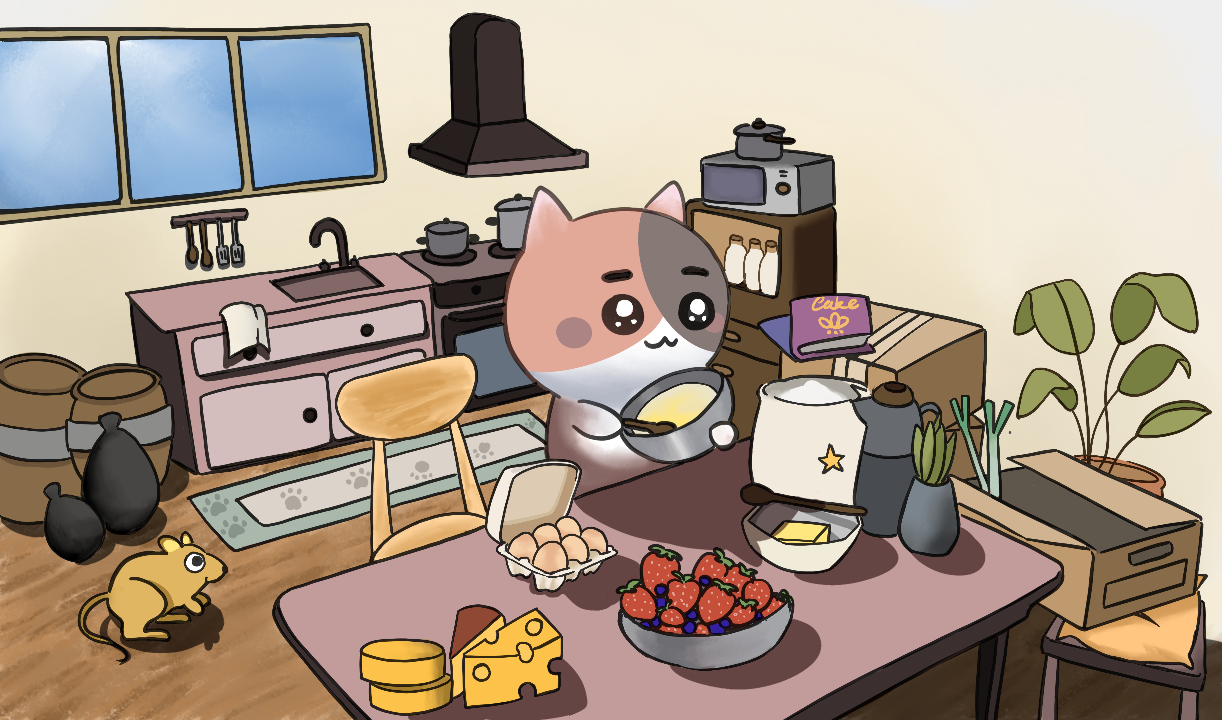 Felyne’s Kitchen is a cozy Unity 3D platformer combining miniature-world exploration, ingredient collection, hazards, and cooking QTEs. As a tiny cat, you dodge flames and mice, mix ingredients through QTEs, and bake a cake leading to HE or BE, depending on your performance.